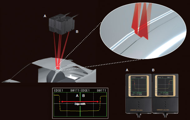通過連接2台控製器,並使用2台傳感器探頭同時進行測量,可最大將測量範圍擴大到140MM,如果采用多台連接測量方式,根據實際用途,歐姆龍將為用戶提供適合的連接方案實現測量。