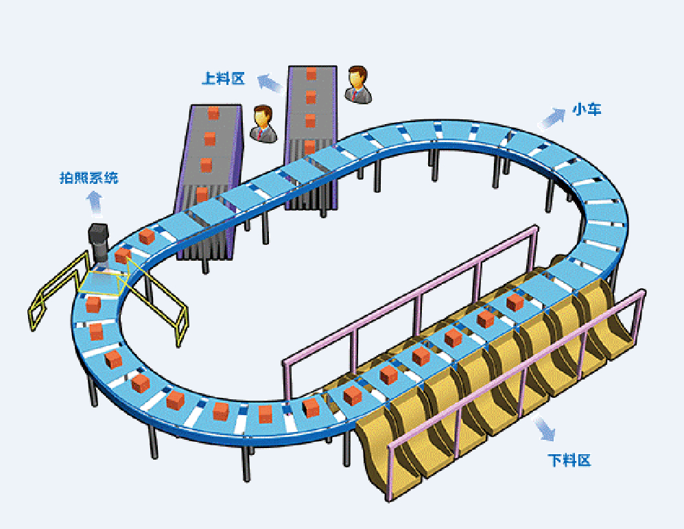 環形分揀線是整個智能物流係統中的核心設備,是提高分揀效率的關鍵環節。該設備主要由小車、拍照係統、上料區、下料區(也叫格口區)這四部分組成:
