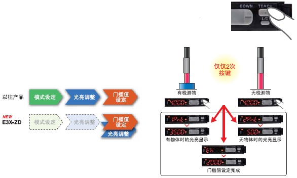 被檢測物體有無狀態下,各按一次示教(TEACH)鍵,即可完成門檻值設定。