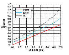 檢測物體是非磁性金屬時,與 磁性金屬相比線性變差。 特別是SUS、鋁合金等,為了提 高其線性,搭載了材質選擇功 能。