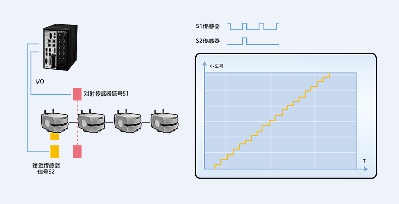 通過多個傳感器組合,采用I/O累加和信號置零的方式,經過計算推導,得到每個小車的實時位置。