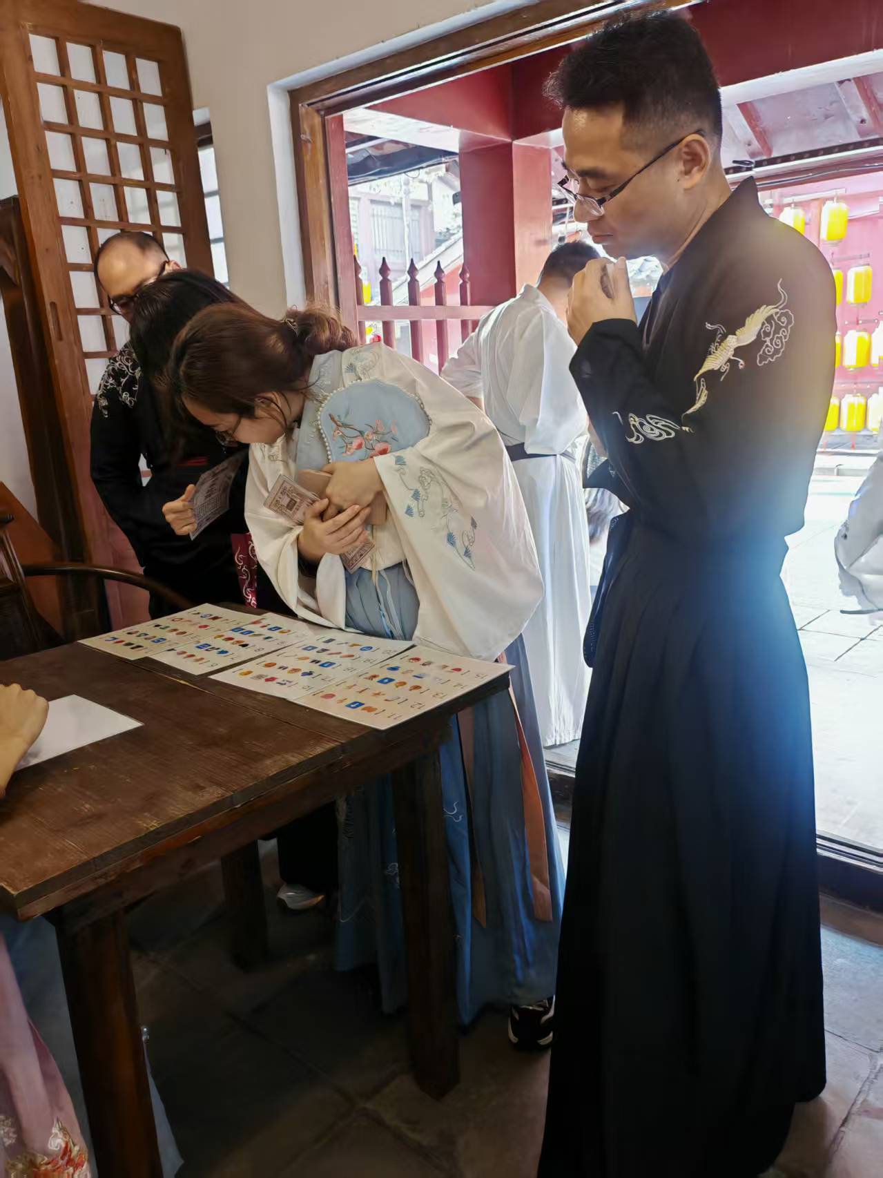 劇本線索與古鎮場景深度綁定,“寶藏” 的蹤跡藏於街頭巷尾的細節之中:或許是某扇木門上的雕花暗號,或許是牆角石碑的隱晦刻字,或許是商鋪招牌後的隱藏提示。大家迅速分組,明確分工:探索組穿梭於街巷之間,不放過任何一個可疑角落;分析組圍坐梳理線索,串聯碎片化信息;協調組跨組溝通,共享關鍵發現;攻堅組聚焦難點謎題,合力突破瓶頸。